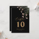 A freestanding table number card adorned with delicate wildflower illustrations on a black background.