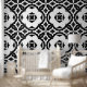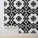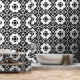 This peel and stick wallpaper features a bold and intricate design that effortlessly combines modern and classic elements. The pattern showcases a striking black and white contrast, creating an elegant visual effect. Interconnected geometric shapes, including diamonds and stylised floral motifs, form a repeating pattern across the surface. This sophisticated design can transform any room into a statement piece without overwhelming the space. Perfect for those looking to enhance their interior decor with minimal effort, this wallpaper adds a touch of elegance and modern appeal to any setting.