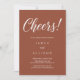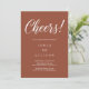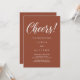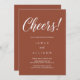 Invite your loved ones to celebrate your special day with this elegant Cheers Script Terracotta Wedding Invitation. Featuring a warm and inviting terracotta background, this design is beautifully accented with a graceful 'Cheers!' in classic white script. The earthy, rustic hue adds a touch of bohemian charm and warmth, making it perfect for fall weddings, outdoor ceremonies, desert-inspired themes, or any couple desiring a cosy and stylish celebration. Customisable with your names, wedding date, venue, and RSVP details, this invitation promises to set a unique and memorable tone for your joyful union.