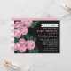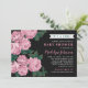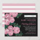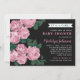 Stylish baby shower invitations features a pretty floral illustration design of dusty rose / mauve pink garden rose flowers with rich green leaves against a soft black background. The stylish custom text can be fully-personalised for the special event you are planning. A pattern of wide white horizontal stripes against a coordinating pink background dresses up the back of the card.
