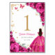 Fuchsia pink, gold and white Quinceanera celebration table number cards. Features brunette girl in ball gown dress, script font, gold butterflies, hot pink roses and tiara. Perfect for an elegant princess style glam celebration. Personalize with your own details.