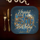 The design features a bold, dazzling “50” surrounded by a celebration of shimmering blue and gold gemstones. The golden script of “Happy Birthday” dances around this centerpiece, adding a layer of elegance and charm that will make any guest smile. All of this is set against a deep blue backdrop, the kind of shade that whispers sophistication while allowing every design detail to shine.