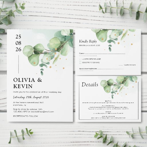 An elegant RSVP card featuring watercolor eucalyptus greenery with refined gold accents. A chic addition to your wedding stationery suite, perfect for rustic, boho, or modern celebrations. Customise this response card to match your elegant wedding style and gather guest replies with ease.