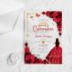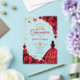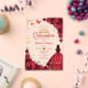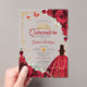 Red gold Quinceanera celebration acrylic invitation. Features brunette girl in ball gown dress, script font, gold butterflies, roses and tiara. Perfect for an elegant princess style glam celebration. Personalize with your own details. Stylish transparent or frosted acrylic invitations.