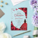Red silver Quinceanera celebration acrylic invitation. Features brunette girl in ball gown dress, script font, silver butterflies, roses and tiara. Perfect for an elegant princess style glam celebration. Personalize with your own details. Stylish transparent or frosted acrylic invitations.
