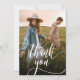 Modern Boho Chic Calligraphy Script 2 Photo Wedding Thank You Card. Stylish wedding thank you template featuring a full vertical photo on the front with the text "Thank You" in a whimsical swirly hand lettering typography swash tail font script white overlay on the picture. At the back side pre-made thank you message with one photo. Easily to personalise your name and thank you message. If you prefer to handwrite your note, just delete the sample text to make more space. If You need help or matching item, please contact to me!