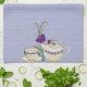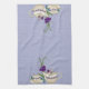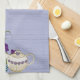 Add a unique focal point to your kitchen w/a trendy kitchen towel featuring elegant china teapots, matching cups & saucers and playful, stylised fantasy flowers in 3 shades of purple with teal coloured swirls tumbling at its' base, all upon a background of lavender faux raw silk. Perfect for kitchens, dining room, tea shops, cafés, etc. Suitable for many decorating styles.