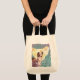 The printing came out very well, better than I had anticipated. The natural color fabric is sturdy with strong seams and comfortable handles. This tote fits easily over my shoulder. As it is filled, the bottom flattens out--very cool! I would buy this product again. This grocery tote holds a lot of groceries! The image quality was very good. The colors were a little darker than I had expected. The darkness may have been due to printing on a natural color fabric rather than on white. The cat design is attractively centered on the tote. The spirit of the design is very lively, just as it appears on the Zazzle website.
