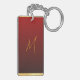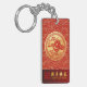 An elegant visual of a snake in red with blossoms into a circle (inspired by traditional Chinese paper-cut) with golden circle overlay a red and yellow traditional Asian pattern + graphic "HAPPY NEW YEAR" in Chinese and English and old Chinese calligraphy for "snake" on gradiant red colour band. Design on rectangular keychain with monogram to personalise in back..