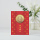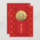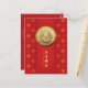 Golden Rabbit paper-cut into a golden circle with "Year of the Rabbit" + "Happy Chinese New Year" in English and Chinese (calligraphy) on a decorated red pattern background. Design on vertical postcard. Perfect for Chinese New Year of the Rabbit 2023.