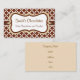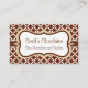 An elegant chocolate brown and white pattern decorates this stylish business card. Customise this business card to suit your needs. Add or delete information, change the font style, font size, etc...The design is from original art. Use this stylish business card for a spa, salon, small business, home decor, event planner, bakery, candy shop, chocolatier, ice cream shop, coffee shop, cafe, etc...
