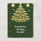 A festive illustration featuring a golden Christmas tree adorned with ornaments, surrounded by decorative snowflakes and festive elements, set against a dark green background, evoking warmth and seasonal joy.