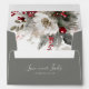 Christian wedding silver envelope depicts an elegant Christmas, winter floral watercolor with a white flower, red berries, silver holly leaves and evergreens. It features return address and Bible Verse from 1 Corinthians 13:8, "Lover never fails."