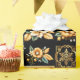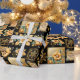 Beautiful golden and ivory flowers, gold ornaments, and "Merry Christmas" text on a contrasting black background creates beautiful and elegant wrapping paper for your Christmas gifts.