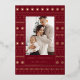 Bring cozy winter cheer to your greetings with this charming holiday card inspired by a Fair Isle sweater pattern. The rich burgundy red background is covered in festive stars, hearts, and snowflakes, all shimmering brilliantly in eye-catching rose gold foil. Your cherished family photo is elegantly framed, with the greeting "Merry Christmas" and your family name beautifully accented in matching rose gold foil for a stylishly warm and traditional look.
