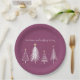 Elegant Christmas Dining Purple Paper Plates decorated with White Christmas Trees and Golden Stars on a soft purple background. The text includes: the stars are brightly shining. Be sure to look for the matching Elegant Christmas Dining Purple Holiday accessories to match.