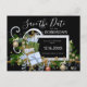 Elegant christmas save the date card, featuring a christmas frame of presents, a variety of gold baubles, ribbons, bows and christmas tree branches. The postcard has a classic black background and a modern white text template which is easy to personalise.