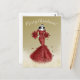 Elegant illustration of a modern woman in a red dress full of roses. Background is a sparkling gold. The words "Merry Christmas!" are written in a trendy calligraphy.