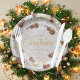 These music themed Christmas paper plates feature a pattern violins entwined with gold ribbons of music staves on a subtle marble background texture, with elegant script Merry Christmas, and personalisation template for your name or other text.