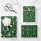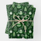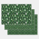 Gift wrap set with three designs that share the same colour scheme, with green being the main colour: the first is a traditional Christmas tree decoration with the phrase Merry Christmas in white, the second is a penrose style mandala pattern and the third is a geometric pattern. The three wrapping papers match perfectly, so you are guaranteed to have your gifts in a uniform and elegant way.