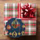 Golden and red Christmas baubles and ornaments are elegantly hung with ribbons, creating a festive and refined holiday decoration display against a dark blue background with subtle snowflakes.