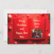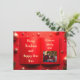 Elegant Christmas photo card design featuring a vibrant red background with golden ornaments, festive pine branches, and a centred photo frame on an open-book style layout. Customisable with your family name and year, this holiday greeting card is perfect for sending warm Merry Christmas wishes to friends and loved ones. A beautiful blend of modern minimalism and timeless Christmas charm.