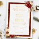 This romantic and classic winter-themed wedding invitation design features clusters of red and white winter flowers, pine, holly berries and rustic twigs custom modern text graphics and editable text fields surrounded by a rich red damask border with real gold foil edges. Back features complementary floral graphic and text field for your website address.