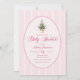 Soft pink baby shower invitation featuring a watercolor Christmas tree, pastel striped background, and a delicate dotted oval frame with elegant typography and festive winter charm.