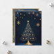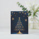 This beautifully designed Christmas card features an elegantly decorated Christmas tree with golden ornaments and lights, topped with a shining golden star. The tree stands prominently against a dark background with subtle leaf patterns and small golden stars hanging around it. At the bottom, "Merry Christmas" is written in elegant golden script. The front of the card captures the festive spirit with its intricate and festive design. On the back, the card features a vintage-style blank page with decorative patterns, providing ample space for writing a personal and heartfelt message. Perfect for sending warm holiday wishes to loved ones.