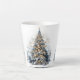 Pretty Latte Mug decorated with watercolor blue and white Christmas tree that is decorated with gold , fancy stars, snowflakes, ornaments, beads and baubles. There is a shining gold star tree topper.