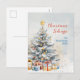 An elegant Christmas tree in vintage watercolor is shown on this lovely holiday postcard. Pretty gold baubles highlight the snowy pine and the topper is a bright star. Pretty gifts and packages surround the base of the tree. The greeting on the front of the postcard is "Christmas Tidings", although you can change that to another seasonal greeting if you prefer. Be sure to edit the example family name and date.