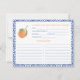 Recipe card design adorned with a simple hand painted orange with green leaves, against an antique blue white text accents to match my bridal shower invitation designs in the same colorway.
