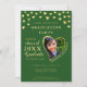 Create a unique photo graduation invitation for the class of 2025 graduate designed in green and gold colours decorated with hearts. Templates make it easy to personalise the invites with your data and upload a photo. Name and Family Name are changed separately to have this stylish curved view. Please use the template to upload your photo to have the same heart-shaped image of the graduate. Try a few photos to choose which one suit best for a heart-shaped image.