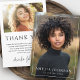 Graduation thank you card featuring your photo with a thin, white border and the graduate's name in an elegant serif font with the year below. Additional photo and custom thank you message on the back. Black text on white background. Colours and fonts can be customised.