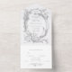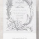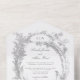 This classic suite of historic decorative designs is inspired by the 18th century etchings of French court painter Alexis Peyrotte, featuring an ornate light grey on white frame of acanthus leaves, ornate scrolls, flowers and leaves. Includes text field for your monogram/initials. This convenient all-in-one format includes a detachable RSVP/Response card.