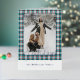 This holiday greeting card stands out with its elegant and unique design. It features a timeless "Happy Holidays" greeting printed in real gold foil, customisable to your preference, on a teal blue, white, and maroon red plaid pattern design. The front offers space for your family name, photo, and custom seasonal greeting, while the back is perfect for adding a personalised seasonal message or poem. It's a stylish way to send your holiday wishes.