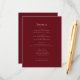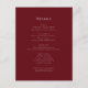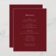 Announce your wedding details with style using this elegant burgundy wedding enclosure card. Featuring a minimalist design with a sophisticated colour palette, this card provides ample space to share all the essential information your guests need to know, such as reception location, accommodation details, and the wedding schedule. The simple yet refined aesthetic ensures your details are presented clearly and elegantly. Make this card your own by adding your details to complete the look. This perfect complement to your wedding invitations will ensure your guests are well-informed and excited for your special day.
