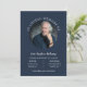 Minimalist memorial service or funeral invitation featuring a photo of your loved one inside a round frame. Navy blue funeral invitation with a round photo of your loved one and the invitation wording in a clean design. Elegant memorial service invitation personalised with a photo and In Loving Memory Of in curved text around the photo. Elegant funeral invitation for men.