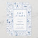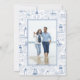 This elegant timeless coastal wedding save the date card with a photo on the back features a seaside toile de jouy pattern of hand drawn lighthouses, sailboats, and ocean waves, reminiscent of summer on the New England coast.