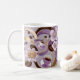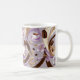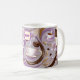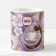 This coffee mug showcases a chic and refreshing design that highlights coffee-themed artistry with flowers and ribbons. The pattern includes steaming coffee cups and coffee beans, all elegantly arranged on a soft lavender background with subtle striped textures. Accentuating the design are luxurious golden and lavender ribbons, creating a sense of sophistication and charm. At the centre, a monogram enclosed in a lavender-framed emblem can be personalised with initials, making this mug an ideal choice for a customised gift or a stylish addition to a coffee lover’s collection.