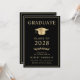 Elegant black college graduation announcement and party invitation featuring a gold graduation cap and simple modern gold typography for the graduate's name, class year, college or university, degree and major or honours. On the reverse side, add the graduation details.