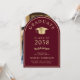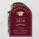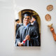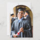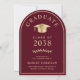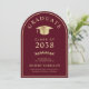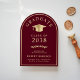 Elegant arch-shaped burgundy red college graduation announcement featuring a gold graduation cap and simple modern gold typography for the graduate's name, class year, college or university, degree and major or honours. The grad's photo fills the back of the card.