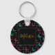 Custom keychain personalised with your name. Designed with an elegant pattern with a graphic illustration of fluttering butterflies in many bright colours, contrasting very nicely on the black background. Whimsical florals, sprigs and leaves add a bit of charm. A black frame with a gold coloured border layered over top with your personalised text inside.