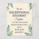 Featuring a soft parchment-style background with watercolor leaves and gold accents, this card delivers a heartfelt message: “To an EXCEPTIONAL STUDENT – Your hard work, growth, and positivity have made an impact. Keep up the great effort.”