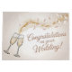 An elegant and celebratory image featuring a beautiful greeting card design. It shows two champagne flutes toasting, accompanied by a festive stream of golden glitter and delicate petals. The text "Congratulations on your Wedding!" is written in a graceful, flowing script.