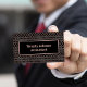 This elegant business card template is designed for an accountant but can be adapted to any profession, ranging from finance to marketing to management. It has a pattern of delicate copper coloured "wire" shape lines, intersecting in a lovely almost organic floral look that's elegant but unique. The pattern surronds a colour block of black surrounded by a copper - some might say rose gold - coloured stately border. Your name and title appear in light copper colord text. On the back is a block of text with a template you can easily customise to include your contact details.