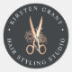 Label your correspondence or products with these chic stickers that match our Floral Scissors logo branding suite for hairstylists and salons. Rich soft black stickers feature a faux copper foil scissors illustration in the center, with two text fields curving around the outside, in classic white lettering.