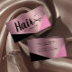 Modern business card for hairdressers or hairstylist with scissors, faux rose gold, pink & black geometric background and elegant calligraphy font.