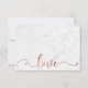 This subtle, elegant wedding and event invitation suite combines wedding design trends in a fresh way. Over a white marbled background, I've used a beautiful modern script font to render graphics depicting key words and phrases in the design set. In this case, the pretty script font reads "rsvp" and "m" on the front, and "love" on the back. To the elegant type I've added faux-copper leaf metallic embellishments which feature simulated reflections for added festivity. All editable text appears in a complementary copper-hue, in a versatile serif font. //