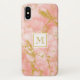 An elegant coral marble pattern streaked with faux gold glitter. Personalise by adding your initial to the white and gold coloured square monogram badge. Flat printed image, NOT actual glitter.